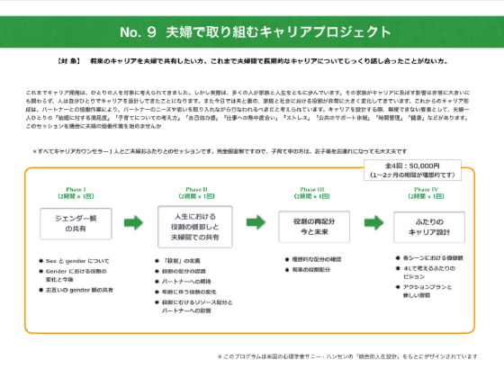 通常、キャリアを設計する際の重要事項には、「結婚に対する満足度」「子育てについての考え方」「自己効力感」「仕事への熱中度合い」「ストレス」「公共のサポート体制」「時間管理」「健康」などがあります。このコースは、それらを念頭に置きながら、さらにキャリアとジェンダーの大家であるサニー・ハンセンの理論(統合的人生設計)を基に、夫婦が互いをより深く理解し、今後の方向性を共有できるようにデザインしました。