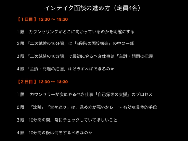 ここでものを言うのが面談の「進め方」。行き当たりばったりの面談では、この二大評価項目をクリアできません。このセミナーでは「進め方」に重点を置き、「この先どうするのか」に自分で答えを出し、意図的に面談を展開できるようになるトレーニングを丁寧にわかりやすく行っていきます。そこではじめて「主訴・問題の把握」と「自己探索の支援」が可能になります。