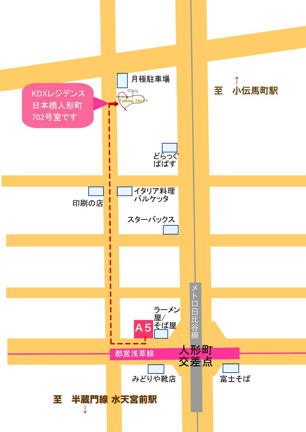 営団地下鉄日比谷線・都営浅草線「人形町」駅 A5出口より徒歩4分